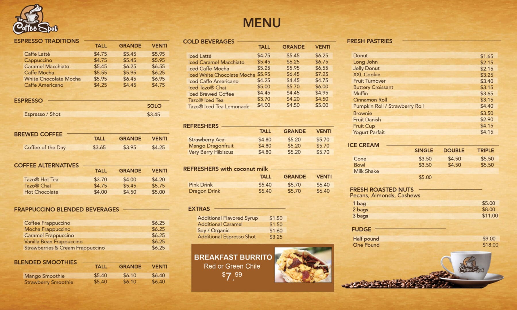 From lattes and frappuccinos to pastries and breakfast burritos, Coffee Spot is your go-to for something fast, warm, and satisfying.